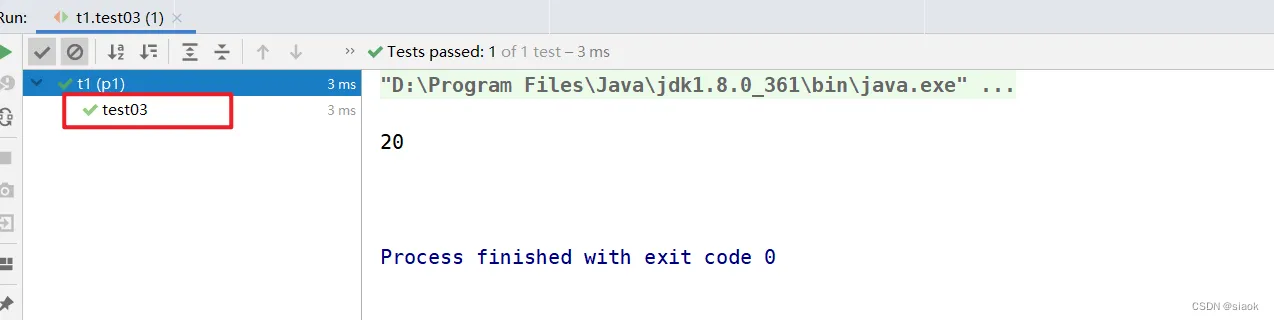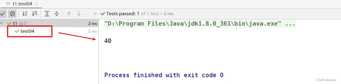 @Test public void test03() throws Exception{ Class<?> aClass = Class.forName("testP1.testMain");//获取class对象 Object testMain = aClass.newInstance();//获取testP1.testMain类的实例对象 Method doubleValueMethod = aClass.getDeclaredMethod("doubleValue", int.class); /* 如何唯一的确定某个类的方法? (1) 类: 通过cLazz对象确定是testMain类 (2) 方法名: doubleValue (3) 形参列表:因为有可能doubleValue会有重载 */ Object returnValue = doubleValueMethod.invoke(testMain, 10);//获取返回值 System.out.println(returnValue); } @Test public void test04() throws Exception{ Class<?> aClass = Class.forName("testP1.testMain");//获取class对象 Object testMain = aClass.newInstance();//获取testP1.testMain类的实例对象 Method doubleValueMethod = aClass.getDeclaredMethod("doubleValue", long.class); System.out.println(doubleValueMethod.invoke(testMain,20)); }