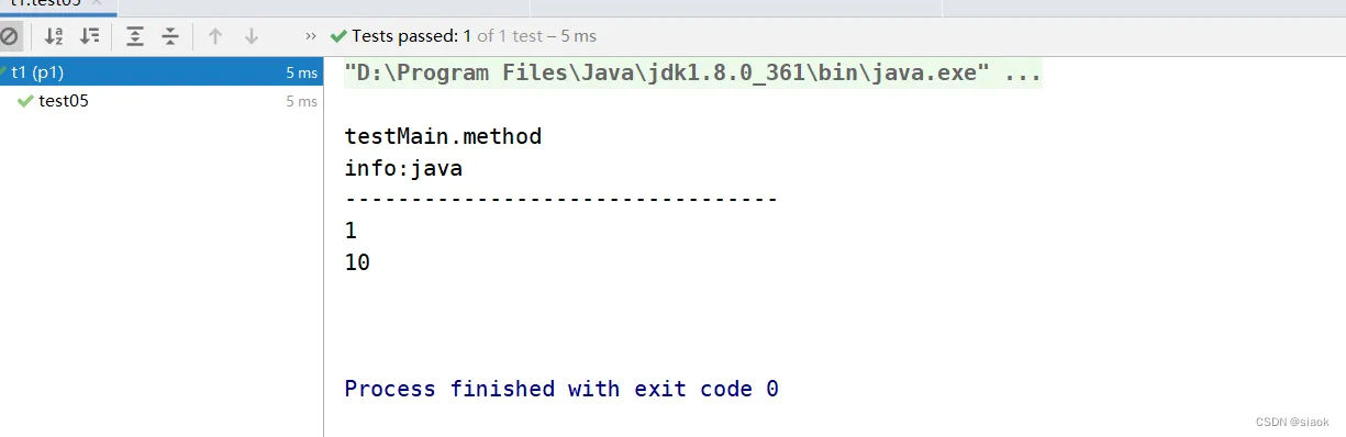 @Test public void test05() throws Exception{ //通过反射调用testP1.testMain类的静态方法 Class<?> aClass = Class.forName("testP1.testMain");//获取class对象 Method getInfo = aClass.getDeclaredMethod("getInfo", String.class); getInfo.invoke(null,"java");//null 表示这里不需要testP1.testMain类的对象,它是静态方法;Java相当于getInfo方法的实参 System.out.println("---------------------------------"); //通过反射调用testP1.testMain类的静态变量 Field bField = aClass.getDeclaredField("b"); bField.setAccessible(true); System.out.println(bField.get(null));//null 表示这里不需要testP1.testMain类的对象,它是静态变量 bField.set(null,10); System.out.println(bField.get(null));//null 表示这里不需要testP1.testMain类的对象,它是静态变量 }