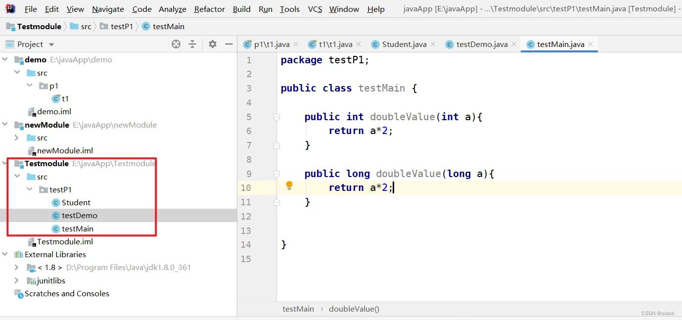 public class testMain { public int doubleValue(int a){ return a*2; } public long doubleValue(long a){ return a*2; } }