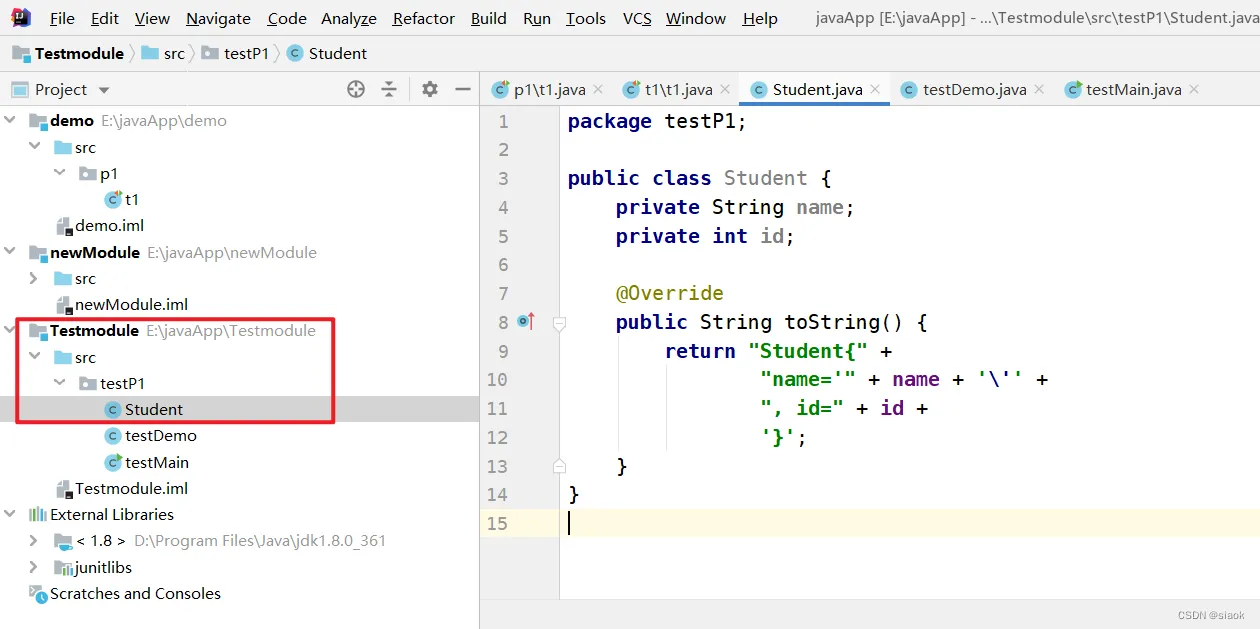 public class testDemo { private String name; private int id; public testDemo(String name, int id) { this.name = name; this.id = id; } @Override public String toString() { return "testDemo{" + "name='" + name + '\'' + ", id=" + id + '}'; } }