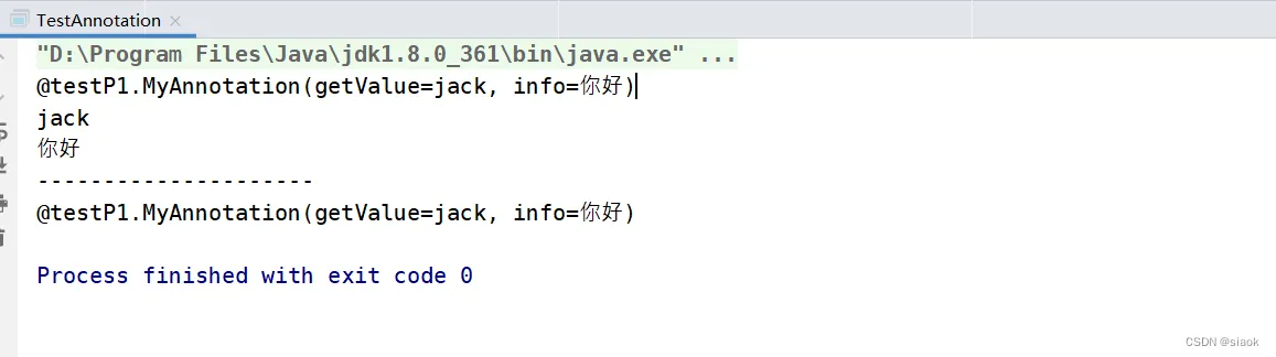 import java.lang.annotation.Annotation; public class TestAnnotation { public static void main(String[] args) { Class aClass=MyClass.class; //获取Annotation对象 Annotation annotation = aClass.getAnnotation(MyAnnotation.class); System.out.println(annotation); MyAnnotation my=(MyAnnotation)annotation; //需要向下转型,才能调用MyAnnotation对象的抽象方法 System.out.println(my.getValue()); System.out.println(my.info()); System.out.println("---------------------"); Class c1=MySub.class; //获取Annotation对象 Annotation annotation1 = c1.getAnnotation(MyAnnotation.class); System.out.println(annotation1); } }