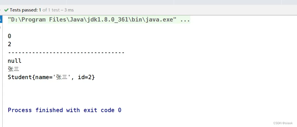@Test public void test02() throws Exception{ //通过反射创建Student类的对象,通过反射给student类的对象的id和name属性赋值,并通过反射获取它们的值 Class<?> aClass = Class.forName("testP1.Student");//获取模块Testmodule下的testP1.Student类的class对象 Object stud = aClass.newInstance();//获取Student类的实例对象 Field idField = aClass.getDeclaredField("id");//获取id属性的Field对象 idField.setAccessible(true);//将Student类id属性的权限修饰符设为允许访问,之前是private,不允许访问 System.out.println(idField.get(stud));//获取id属性的值 ==> stud.id idField.set(stud,2);//给stud的id属性赋值 ==> stud.id=2; System.out.println(idField.get(stud)); System.out.println("----------------------------------"); //给stud的name属性赋值 Field nameField = aClass.getDeclaredField("name");//获取name属性的Field对象 nameField.setAccessible(true); System.out.println(nameField.get(stud)); nameField.set(stud,"张三"); System.out.println(nameField.get(stud)); System.out.println(stud); }