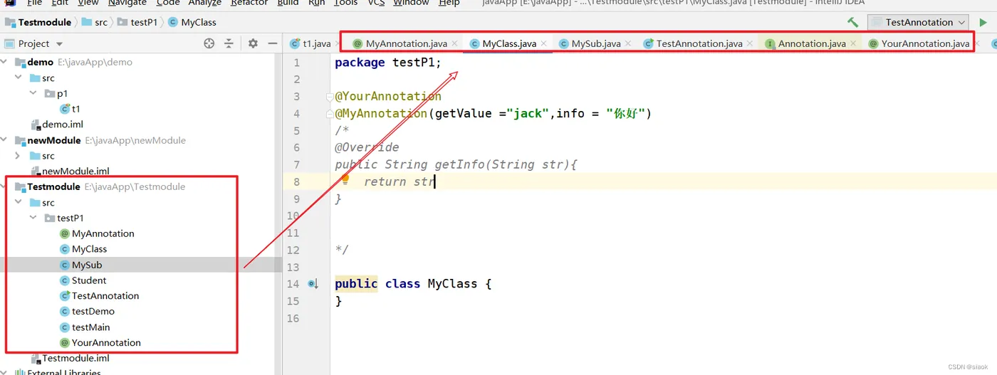 @YourAnnotation @MyAnnotation(getValue ="jack",info = "你好") /* @Override public String getInfo(String str){ return str } */ public class MyClass { }