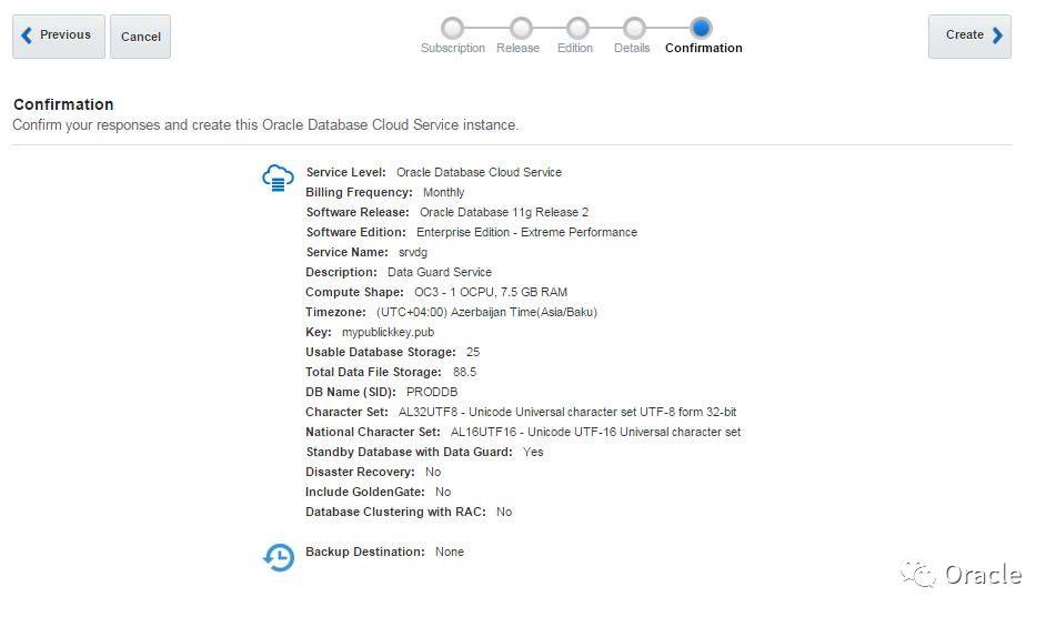 Reviewthe configuration settings and click Create to create a primary and a standby database