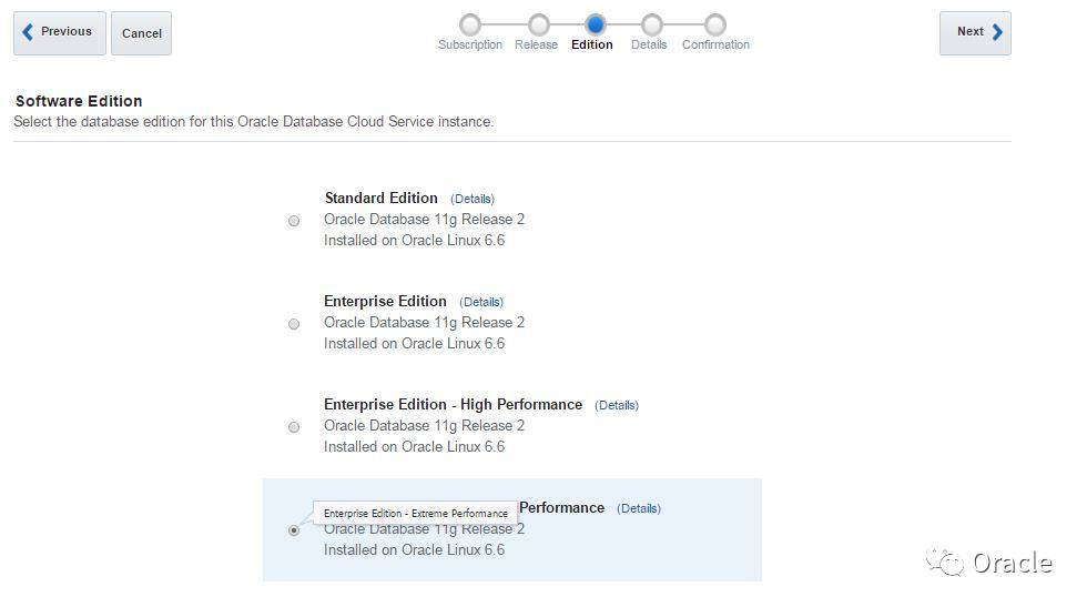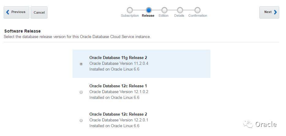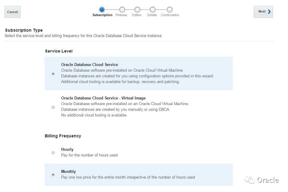登录云账号,跳转到Oracle Database Cloud Service页面,创建一个新服务。选择“OracleDatabase Cloud Service”作为订阅类型,然后点击下一步。
