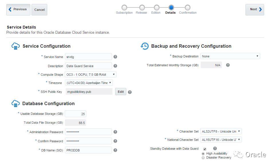 填写服务名,SSH公钥,然后选择“Standby Database with Data Guard”“ High Availability”选项,然后点击下一步。