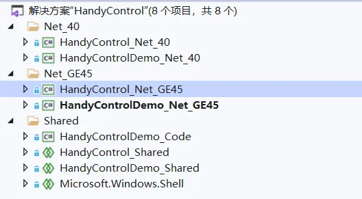 Net_40文件夹下代表着支持Net Fx4.0的相关案例和程序集,HandyControlDemo_Net_40是对应的4.0的启动项目入口,本地需要安装.Net Framework4.0