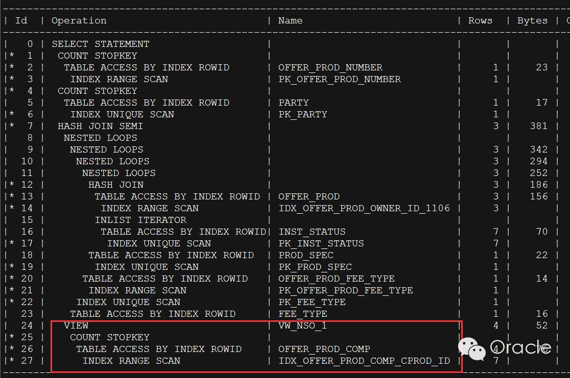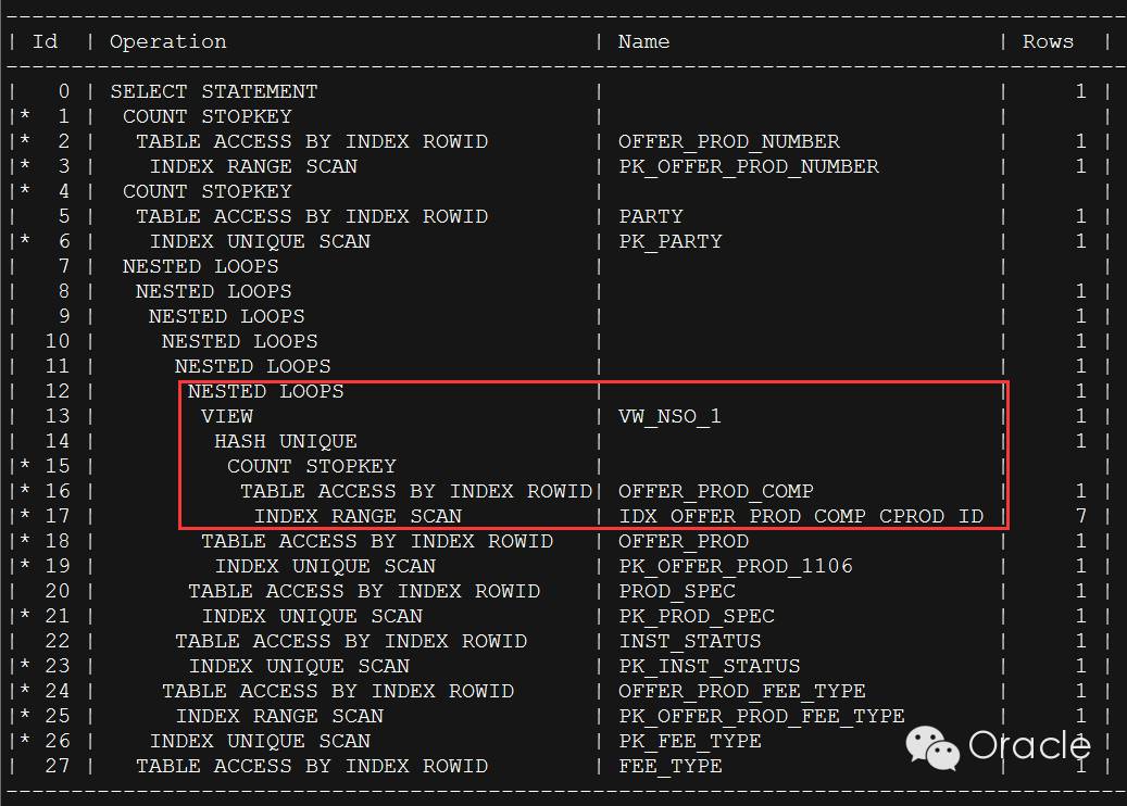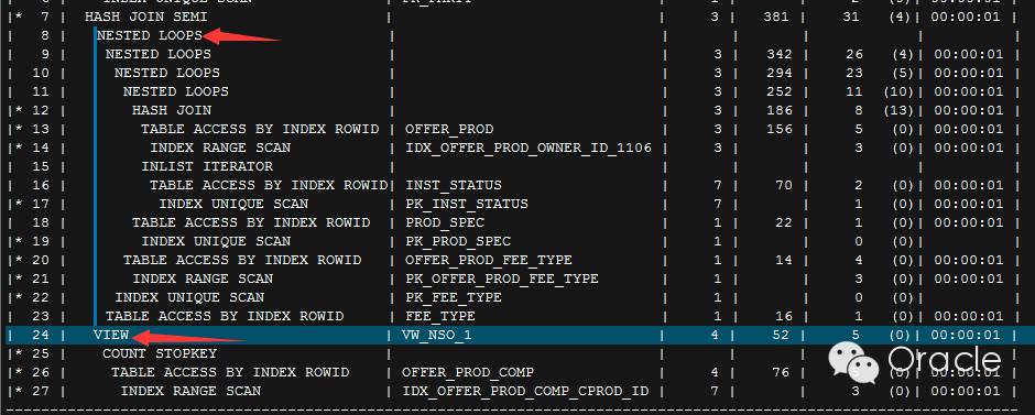 在执行计划中,这里特意把子查询标记出来,就是需要引起重视,子查询当着一个整体与主查询做 HASH 连接,没有作为驱动表走 NL,也就可以肯定整个执行计划连最基本的驱动表都选择错误。下图可以更直观的看到。
