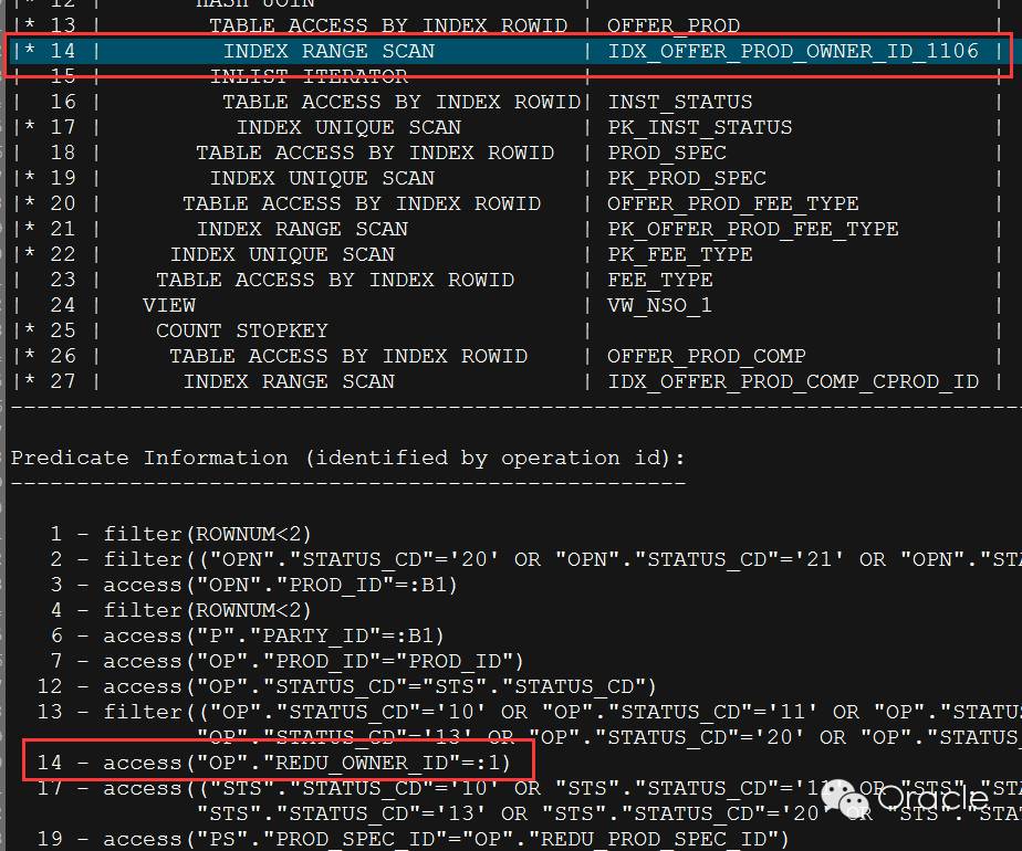 在执行计划中,我们看到当前执行计划的驱动表示 OFFER_PROD(OP) 这个表,与之前我们猜想一样,那么基本可以肯定,redu_owner_id 列的数据存在倾斜,当返回大量结果集时,性能就很不好。