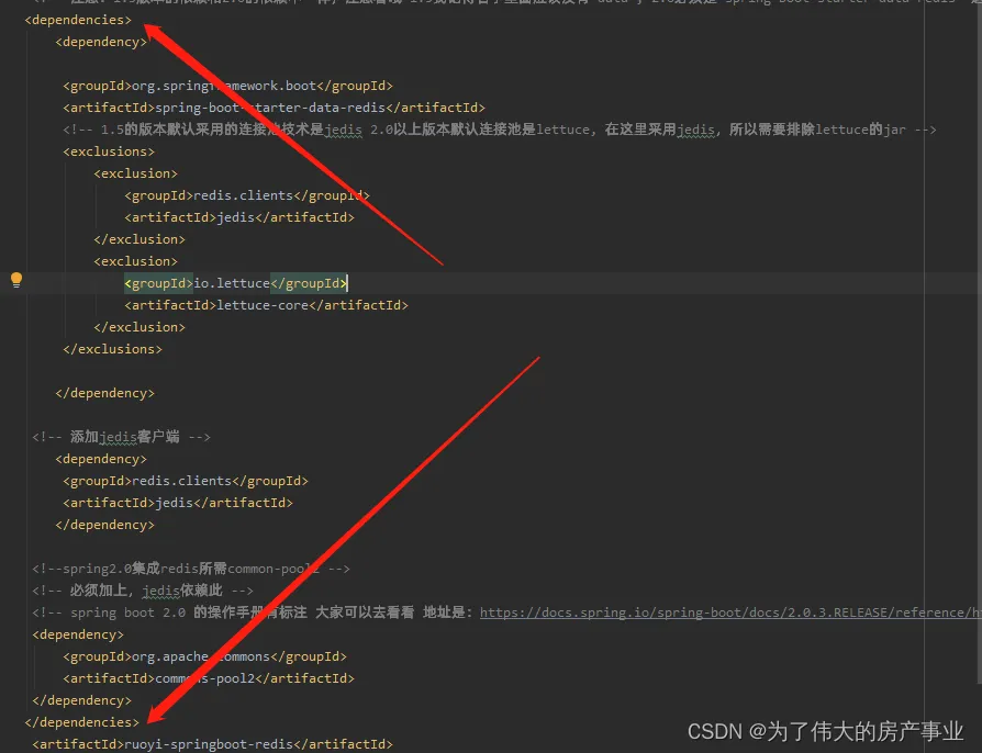 1. <!-- Spring Boot Redis依赖 --> 2. <!-- 注意:1.5版本的依赖和2.0的依赖不一样,注意看哦 1.5我记得名字里面应该没有“data”, 2.0必须是“spring-boot-starter-data-redis” 这个才行 --> 3. <dependency> 4. <groupId>org.springframework.boot</groupId> 5. <artifactId>spring-boot-starter-data-redis</artifactId> 6. <!-- 1.5的版本默认采用的连接池技术是jedis 2.0以上版本默认连接池是lettuce, 在这里采用jedis,所以需要排除lettuce的jar --> 7. <exclusions> 8. <exclusion> 9. <groupId>redis.clients</groupId> 10. <artifactId>jedis</artifactId> 11. </exclusion> 12. <exclusion> 13. <groupId>io.lettuce</groupId> 14. <artifactId>lettuce-core</artifactId> 15. </exclusion> 16. </exclusions> 17. </dependency> 18. 19. <!-- 添加jedis客户端 --> 20. <dependency> 21. <groupId>redis.clients</groupId> 22. <artifactId>jedis</artifactId> 23. </dependency> 24. 25. <!--spring2.0集成redis所需common-pool2 --> 26. <!-- 必须加上,jedis依赖此 --> 27. <!-- spring boot 2.0 的操作手册有标注 大家可以去看看 地址是:https://docs.spring.io/spring-boot/docs/2.0.3.RELEASE/reference/htmlsingle/ --> 28. <dependency> 29. <groupId>org.apache.commons</groupId> 30. <artifactId>commons-pool2</artifactId> 31. </dependency>