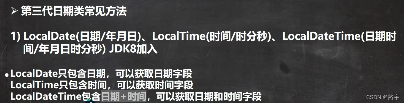 public class LocalDate_ { public static void main(String[] args) { //第三日期 //1.使用now() 返回表示当前日期时间的对象 LocalDateTime localDateTime = LocalDateTime.now();//LocalDate.now();//LocalTime.now(); System.out.println(localDateTime); //2.使用DateTimeFormatter对象来进行格式化 DateTimeFormatter dtf = DateTimeFormatter.ofPattern("yyyy-MM-dd HH:mm:ss"); String format = dtf.format(localDateTime); System.out.println("格式化的日期:" + format); System.out.println("年=" + localDateTime.getYear()); System.out.println("月=" + localDateTime.getMonth()); System.out.println("月=" + localDateTime.getMonthValue()); System.out.println("日=" + localDateTime.getDayOfMonth()); System.out.println("时=" + localDateTime.getHour()); System.out.println("分=" + localDateTime.getMinute()); System.out.println("秒=" + localDateTime.getSecond()); LocalDate localDate = LocalDate.now(); //获取年月日 //提供了plus和minus方法可以对当前时间进行加或减 //看看890天后,是什么时候 LocalDateTime localDateTime1 = localDateTime.plusDays(890); System.out.println("890天后:" + dtf.format(localDateTime1)); LocalDateTime localDateTime2 = localDateTime.minusMinutes(3465); System.out.println("3465分钟前 日期为:" + dtf.format(localDateTime2)); } }