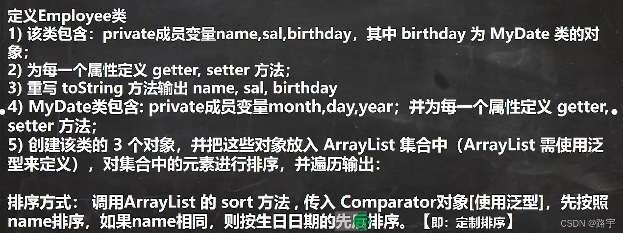 public class GenericExercise02 { public static void main(String[] args) { MyDate myDate1 = new MyDate(1980, 11, 11); MyDate myDate2 = new MyDate(2001, 12, 12); MyDate myDate3 = new MyDate(1980, 11, 10); Employee employee1 = new Employee("tom", 20000, myDate1); Employee employee2 = new Employee("aa小明", 12000, myDate2); Employee employee3 = new Employee("tom", 50000, myDate3); ArrayList<Employee> employees = new ArrayList<>(); employees.add(employee1); employees.add(employee2); employees.add(employee3); employees.sort(new Comparator<Employee>() { @Override public int compare(Employee o1, Employee o2) { //先按照name排序,如果name相同,则按照生日日期的先后顺序,【即:定制排序】 //先对传入的参数进行验证 if (!(o1 instanceof Employee && o2 instanceof Employee)) { System.out.println("类型不正确!"); return 0; //表示不比了,返回0就行了 } //比较name String name1 = o1.getName(); String name2 = o2.getName(); int i = name1.compareTo(name2); if (i != 0) { //说明名字不相同 return i; //按名字的升序排列 加-号 则是降序,或者改为int i = name2.compareTo(name1); } //下面是对birthday的比较,因此我们最好把这个比较,放在MyDate中完成 //封装后,将来的可维护性和复用性,就大大增强。 return o1.getBirthday().compareTo(o2.getBirthday()); } }); System.out.println("==对雇员进行排序后"); for (int i = 0; i < employees.size(); i++) { Employee employee = employees.get(i); System.out.println(employee); } } }