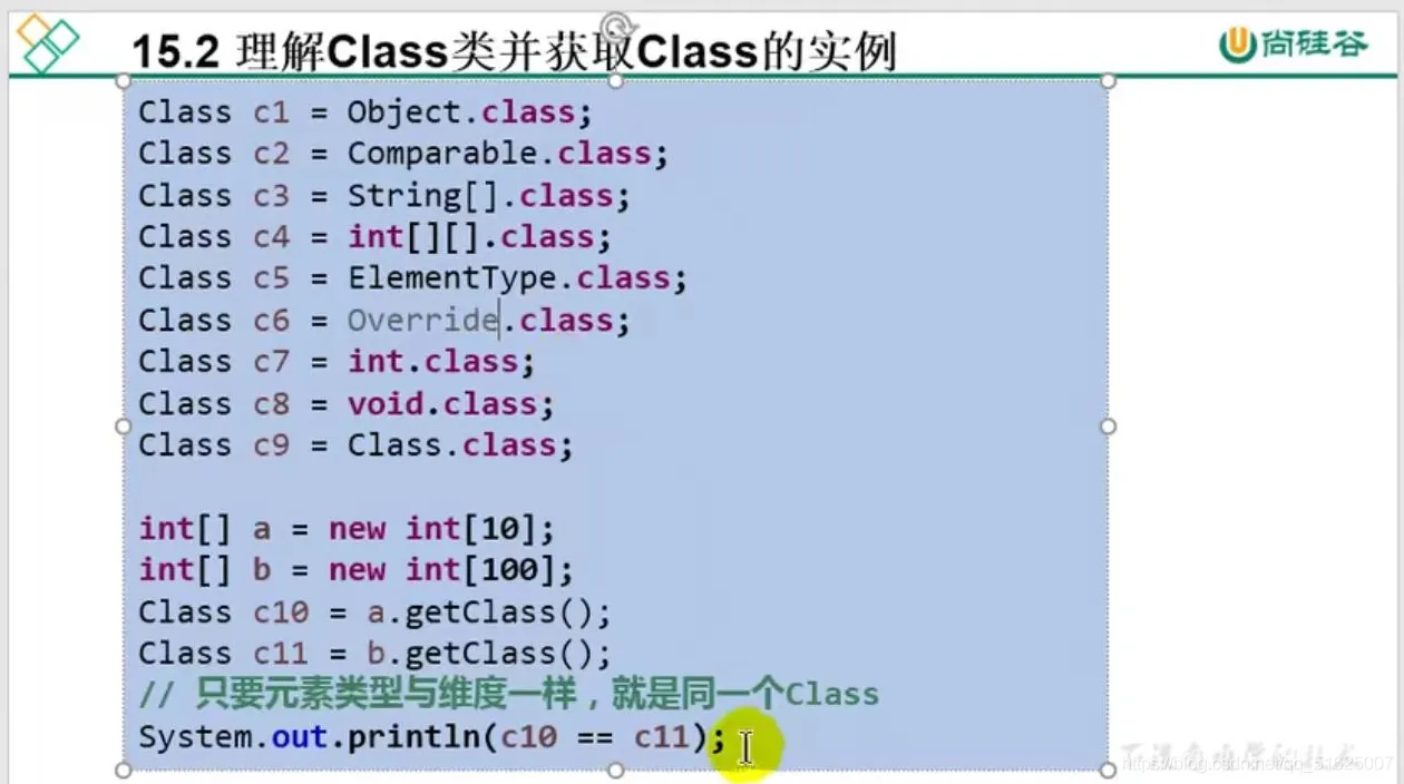 package com.day0322_1; import org.junit.jupiter.api.Test; import java.lang.annotation.ElementType; import java.lang.reflect.Constructor; import java.lang.reflect.Field; import java.lang.reflect.Method; public class ReflectionTest { //反射之前 @Test public void test1(){ //1.创建Person类的对象 Person p1=new Person("Tom",12); //2.通过对象,调用其内部的属性、方法 p1.age=10; System.out.println(p1.toString()); p1.show(); //在Person类外部,不可以通过Person类的对象来调用其内部私有的结构。 //比如:name showNation 以及私有的构造器 } //反射之后,对Person的操作 @Test public void test2() throws Exception { Class clazz =Person.class; //通过反射,创建Person类的对象 Constructor cons = clazz.getConstructor(String.class, int.class); Object obj = cons.newInstance("Tom", 12); Person p=(Person)obj; System.out.println(p.toString()); //2.通过反射,调用对象的指定的方法、属性 //调用属性 Field age = clazz.getDeclaredField("age"); age.set(p,10); System.out.println(p.toString()); //调用方法 Method show = clazz.getDeclaredMethod("show"); show.invoke(p); System.out.println("*******************"); //通过反射,可以调用Person类的私有结构。比如:私有的构造器,方法、属性 //调用私有的构造器 Constructor cons1 = clazz.getDeclaredConstructor(String.class); cons1.setAccessible(true); Person p1= (Person) cons1.newInstance("Jerry"); System.out.println(p1); //调用私有的属性 Field name = clazz.getDeclaredField("name"); name.setAccessible(true); name.set(p1,"HanMeimei"); System.out.println(p1); //调用私有的方法 Method showNation = clazz.getDeclaredMethod("showNation", String.class); showNation.setAccessible(true); String nation= (String) showNation.invoke(p1,"中国");//相当于p1.showNation("中国"); System.out.println(nation); } //疑问:同过直接new的方式或反射的方式都可以调用公共的结构,开发中到底用哪个? //建议:直接new的方式。 //什么时候会使用:反射的方式。 反射的特征:动态性 //疑问:反射机制与面向对象的封装性是不是矛盾的?如何看待两个技术? //不矛盾。 /* 关于java.lang.Class类的理解 1.类的加载过程: 程序经过javac.exe命令以后,会生成一个或多个字节码文件(.class结尾), 接着我们使用 java.exe命令对某个字节码文件进行解释运行。相当于某个字节码文件加载到内存中。此 就称为类的加载过程。加载到内存中的类,我们解称为运行时类,此 运行时类,就称为Class的一个实例。 2.换句话说,Class的实例对应着一个运行时类。 3.加载到内存中的运行时类,会缓存一定的时间。在此时间内,我们可以通过不同的方式 来获取此运行时类。 */ //获取Class的实例的方式(前三种掌握) @Test public void test3() throws Exception{ //方式一:调用运行时类的属性 Class clazz1=Person.class;//可用泛型 System.out.println(clazz1); //方式二:通过运行时类的对象 Person p1=new Person(); Class clazz2 = p1.getClass(); System.out.println(clazz2); //方式三:调用Class的静态方法:forName(String classPath)(多用) Class clazz3 = Class.forName("com.day0322_1.Person"); // clazz3=Class.forName("java.lang.String"); System.out.println(clazz3); System.out.println(clazz1==clazz2);//true System.out.println(clazz1==clazz3);//true //方式四:使用类的加载器:Classloader(了解) ClassLoader classLoader = ReflectionTest.class.getClassLoader(); Class<?> clazz4 = classLoader.loadClass("com.day0322_1.Person"); System.out.println(clazz4); System.out.println(clazz1==clazz4); } //万事万物皆对象?对象xxx,File,URL,反射,前端,数据库操作 //Class实例可以使哪些结构的说明 @Test public void test4(){ Class c1=Object.class; Class c2=Comparable.class; Class c3=String.class; Class c4=int[][].class; Class c5= ElementType.class; Class c6=Override.class; Class c7=int.class; Class c8=void.class; Class c9=Class.class; int [] a=new int[10]; int [] b=new int[100]; Class c10 = a.getClass(); Class c11 = b.getClass(); //只要数组的元素类型与维度一样,就是同一个Class System.out.println(c10==c11);//true } }