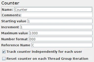 Allows the user to create a counter that can be referenced anywhere in the Thread Group. The counter config lets the user configure a starting point, a maximum, and the increment. The counter will loop from the start to the max, and then start over with the start, continuing on like that until the test is ended. From version 2.1.2, the counter now uses a long to store the value, so the range is from -2^63 to 2^63-1. Control Panel