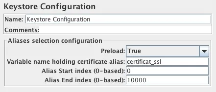 | Alias End Index | The index of the last key to use in Keystore, 0-based. When using "Variable name holding certificate alias" ensure it is large enough so that all keys are loaded at startup. | Yes |