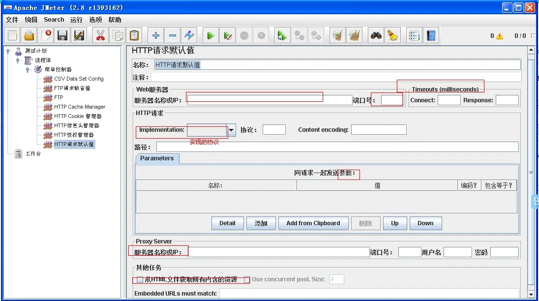 从HTML文件获取所有有内含的资源:当该选项被选中时,jmeter在发出HTTP请求并获得响应的HTML文件内容后,还对该HTML进行Parse 并获取HTML中包含的所有资源(图片、flash等),默认不选中,如果用户只希望获取页面中的特定资源,可以在下方的Embedded URLs must match 文本框中填入需要下载的特定资源表达式,这样,只有能匹配指定正则表达式的URL指向资源会被下载。