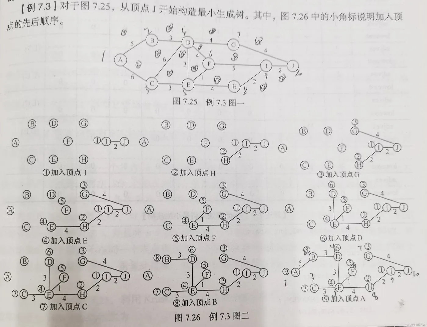 经过上述步骤,TE中包含了G中的n-1条边,此时选取到的所有顶点及边恰好就构成了G的一棵最小生成树。
