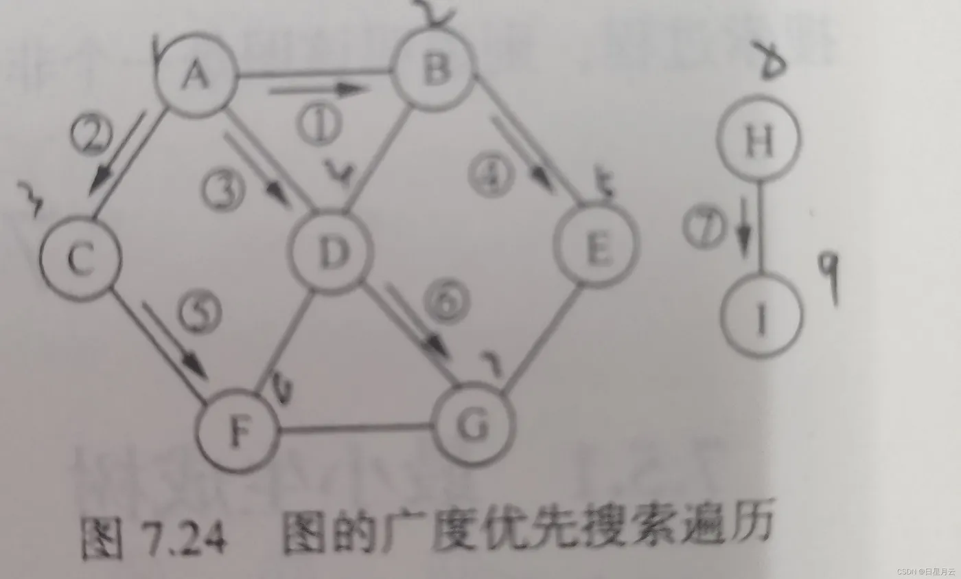 图的广度优先搜索遍历类似于树的按层次遍历,其基本思想为从图中的某个顶点V0出发,在访问此顶点之后依次访问V0。的所有未被访问的邻接点,之后按这些邻接点被访问的先后次序依次访问它们的邻接点,直至图中所有和V0有路径相通的顶点都被访问到。若此时图中尚有顶点未被访问,则另选图中一个未被访问的顶点作为新的出发点,重复上述过程,直至图中所有顶点都被访问到。