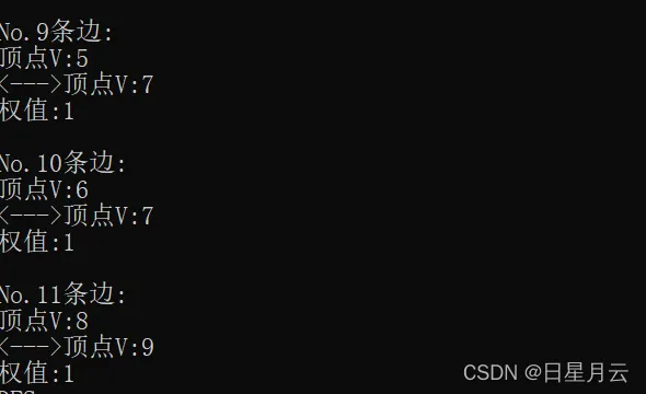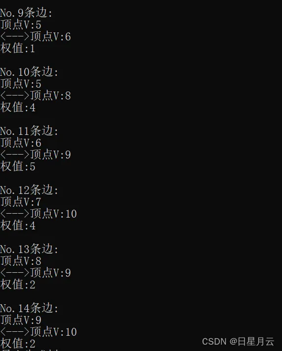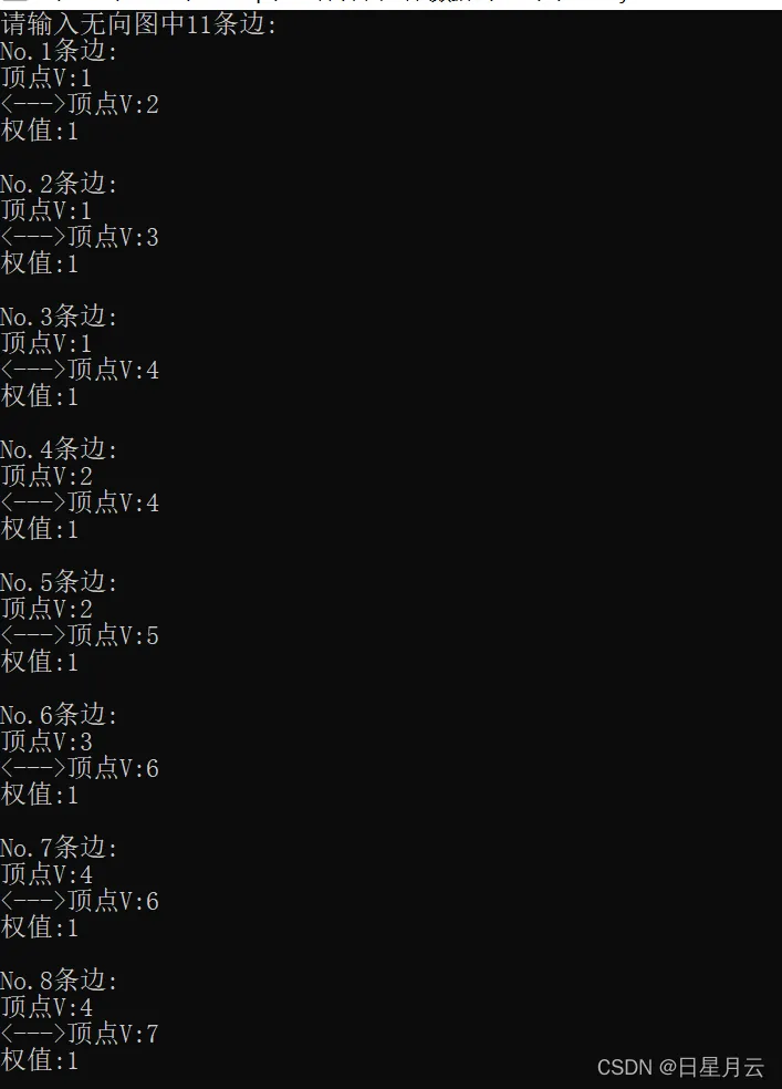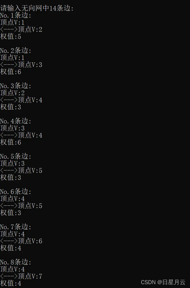 最小生成树 每两个代表生成树一个边的两个顶点 4 7 可以改成7 10也是对的 把printf("%d %d ",u0,v0); 替换为printf("第%d条边:%d--%d--%d\n ",e,u0,min,v0); 就美观了