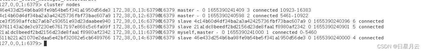 /data # redis-cli -c 127.0.0.1:6379> cluster info cluster_state:ok cluster_slots_assigned:16384 cluster_slots_ok:16384 cluster_slots_pfail:0 cluster_slots_fail:0 cluster_known_nodes:6 cluster_size:3 cluster_current_epoch:6 cluster_my_epoch:1 cluster_stats_messages_ping_sent:155 cluster_stats_messages_pong_sent:144 cluster_stats_messages_sent:299 cluster_stats_messages_ping_received:139 cluster_stats_messages_pong_received:155 cluster_stats_messages_meet_received:5 cluster_stats_messages_received:299 127.0.0.1:6379> cluster nodes 46e433d254b6ba98fe9b54be5f341a1950d56de3 172.38.0.13:6379@16379 master - 0 1655390241409 3 connected 10923-16383 4c14b60d4df34ba2a3a42425736fbf73bac607a9 172.38.0.12:6379@16379 master - 0 1655390240598 2 connected 5461-10922 ce3f3598affcb27a6b7c93651e93d23daabee940 172.38.0.16:6379@16379 slave 4c14b60d4df34ba2a3a42425736fbf73bac607a9 0 1655390240396 6 connected 9761143a2de3c97230e67617197e868c5c6fa99f 172.38.0.15:6379@16379 slave 21a1dc8beedf2bd2156d23de8faa1f8980af2342 0 1655390240901 5 connected 21a1dc8beedf2bd2156d23de8faa1f8980af2342 172.38.0.11:6379@16379 myself,master - 0 1655390241000 1 connected 0-5460 511b221a21070e2daa5e42bf32082e5cb6489766 172.38.0.14:6379@16379 slave 46e433d254b6ba98fe9b54be5f341a1950d56de3 0 1655390240000 4 connected 127.0.0.1:6379>