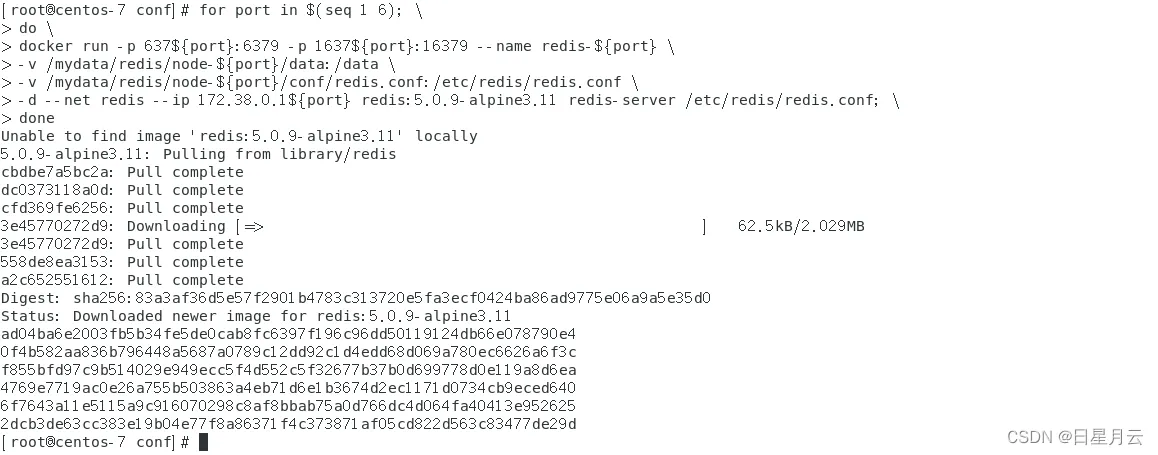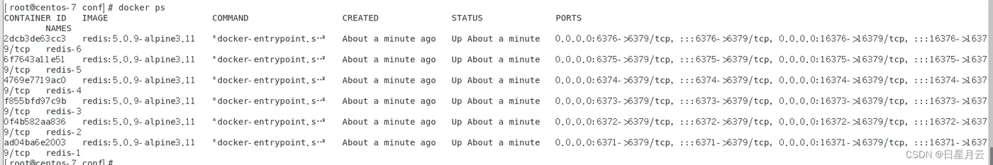 # 创建网卡 docker network create redis --subnet 172.38.0.0/16 # 通过脚本创建六个redis配置 for port in $(seq 1 6);\ do \ mkdir -p /mydata/redis/node-${port}/conf touch /mydata/redis/node-${port}/conf/redis.conf cat << EOF >> /mydata/redis/node-${port}/conf/redis.conf port 6379 bind 0.0.0.0 cluster-enabled yes cluster-config-file nodes.conf cluster-node-timeout 5000 cluster-announce-ip 172.38.0.1${port} cluster-announce-port 6379 cluster-announce-bus-port 16379 appendonly yes EOF done ### 可忽略以下 cd /mydata/ cd redis ls node-1 node-2 node-3 node-4 node-5 node-6 cd node-1 cd conf/ ls redis.conf cat redis.conf port 6379 bind 0.0.0.0 cluster-enabled yes cluster-config-file nodes.conf cluster-node-timeout 5000 cluster-announce-ip 172.38.0.11 cluster-announce-port 6379 cluster-announce-bus-port 16379 appendonly yes ### 可忽略以上 # 通过脚本运行六个redis for port in $(seq 1 6); \ do \ docker run -p 637${port}:6379 -p 1637${port}:16379 --name redis-${port} \ -v /mydata/redis/node-${port}/data:/data \ -v /mydata/redis/node-${port}/conf/redis.conf:/etc/redis/redis.conf \ -d --net redis --ip 172.38.0.1${port} redis:5.0.9-alpine3.11 redis-server /etc/redis/redis.conf; \ done