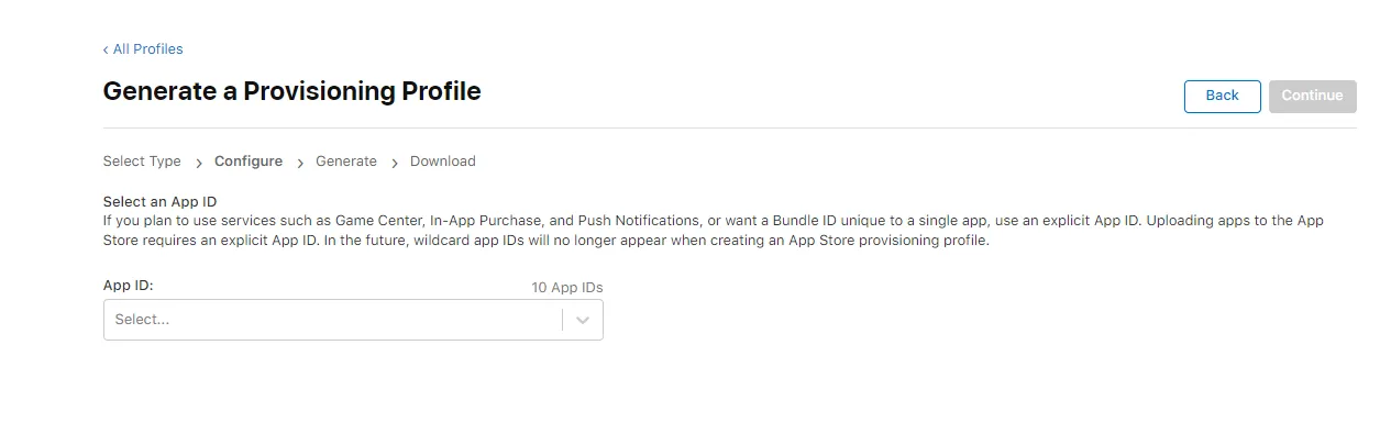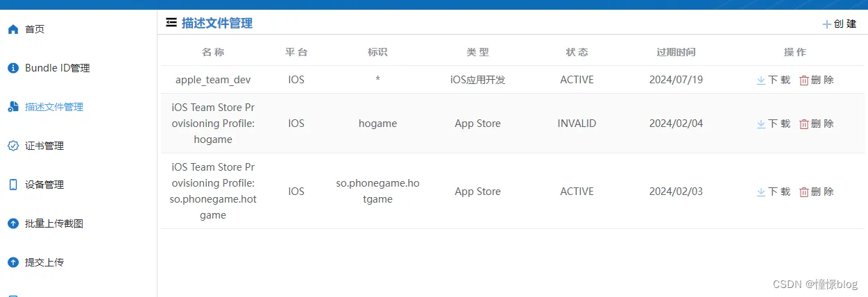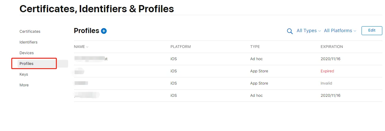 2、假如已经创建好第一步的appId,则可以进入profiles菜单开始创建证书profile文件。