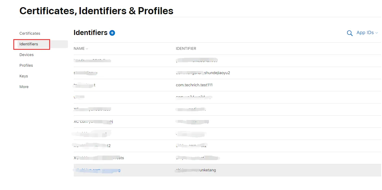 1、进入苹果开发者中心,点击Identifiers,创建appId(包名),创建完后,如下图所示,注意包名的格式大概是这样的java包名格式:com.xxxxxx.yyy