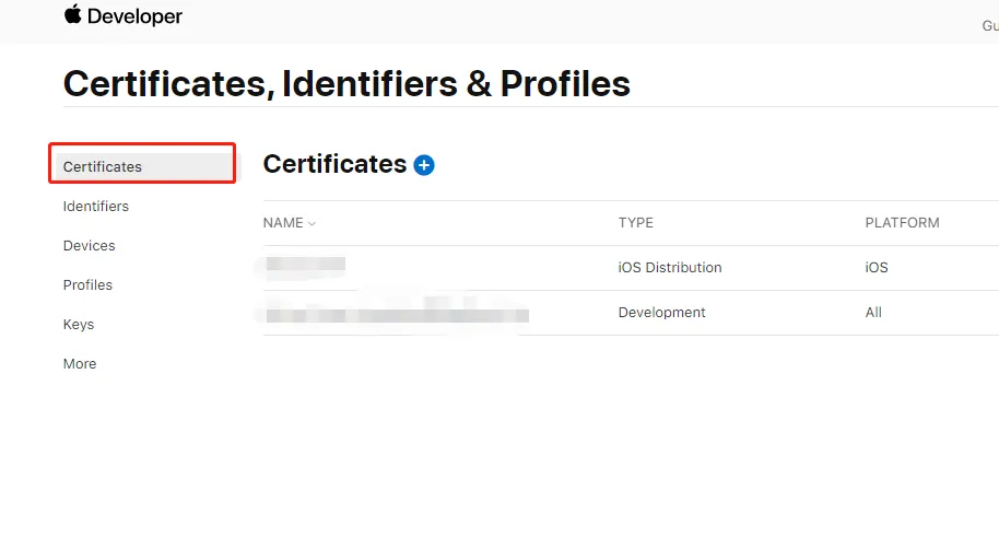 1、登录苹果开发者的后台,点击certificates菜单,进入cer证书管理页面。点击右边的蓝色小加号,开始创建证书,创建证书的时候,证书类型请选择ios distribution ad hoc and app store,这种类型已经包含了真机测试和上架类型(ad hoc是真机测试,app store是上架)。请千万不要选择apple类型或dev类型的证书,那些不能用来在hbuilderx云打包。