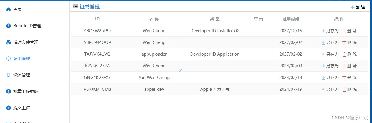 4、回到苹果开发者者中心,appuploader生成的.p12证书会同步回来,即可使用appuploader生成p12格式的苹果证书。