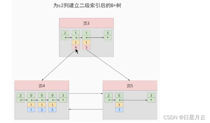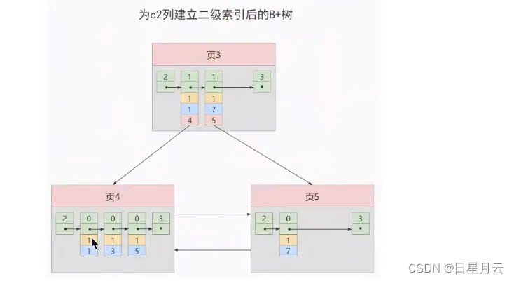 如果二级索引中目录项记录的内容只是索引列+页号的搭配的话,那么为c2列建立索引后的B+树应该长这样: