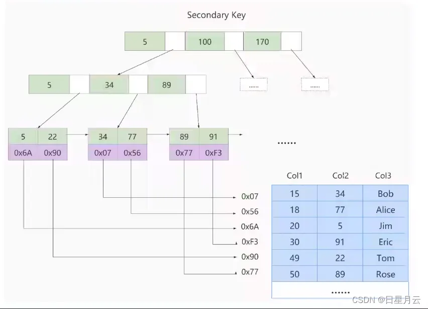 这里设表一共有三列,假设以col1为主键,上图是一个MyISAM表的主索引(Primary key)示意。可以看出MylISAM的索引文件仅仅保存数据记录的地址。yISAM中,主键索引和二级索引(Secondary key)在结构上没有任何区别,只是主键索引要求key是唯一的,而二级索引的key可以重复(需要注意的是,MylSAM中没有聚簇索引和非聚簇索引之说)。如果在Col2上建立一个二级索引,则此索引的结构如下图所示: