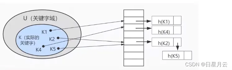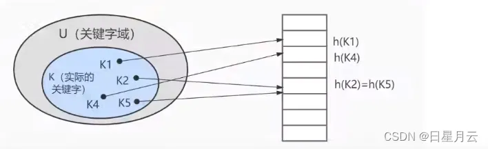 在哈希的方式下,一个元素k处于h(k)中,即利用哈希函数h,根据关键字k计算出槽的位置。函数h将关键字域映射到哈希表T[o…m-1]的槽位上