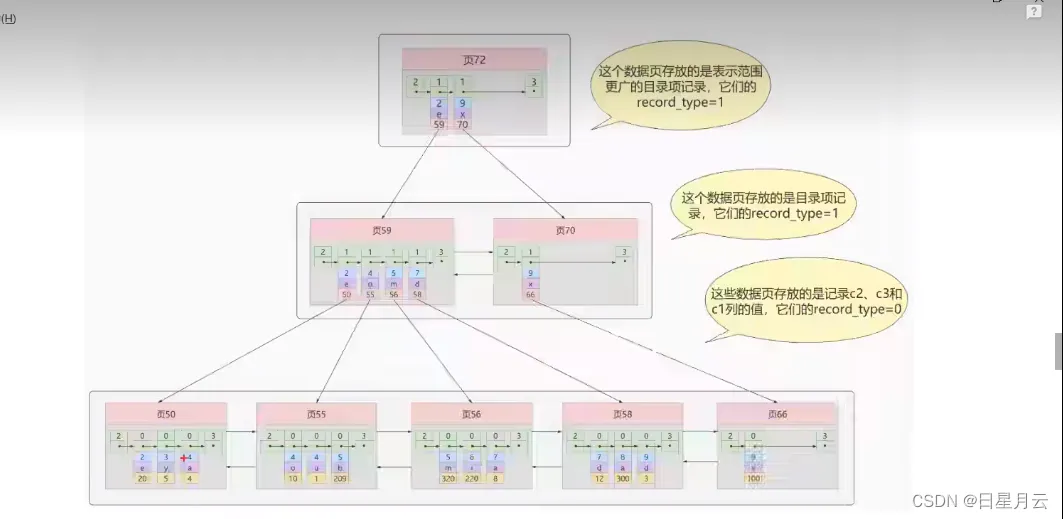 一个B+树只需要很少的层级就可以轻松存储数亿条记录,查询速度相当不错!这是因为B+树本质上就是一个大的多层级目录,每经过一个目录时都会过滤掉许多无效的子目录,直到最后访问到存储真实数据的目录。那如果一个大的目录中只存放一个子目录是个啥效果呢?那就是目录层级非常非常非常多,而且最后的那个存放真实数据的目录中只能存放一条记录。费了半天劲只能存放一条真实的用户记录?所以InnoDB的一个数据页至少可以存放两条记录。