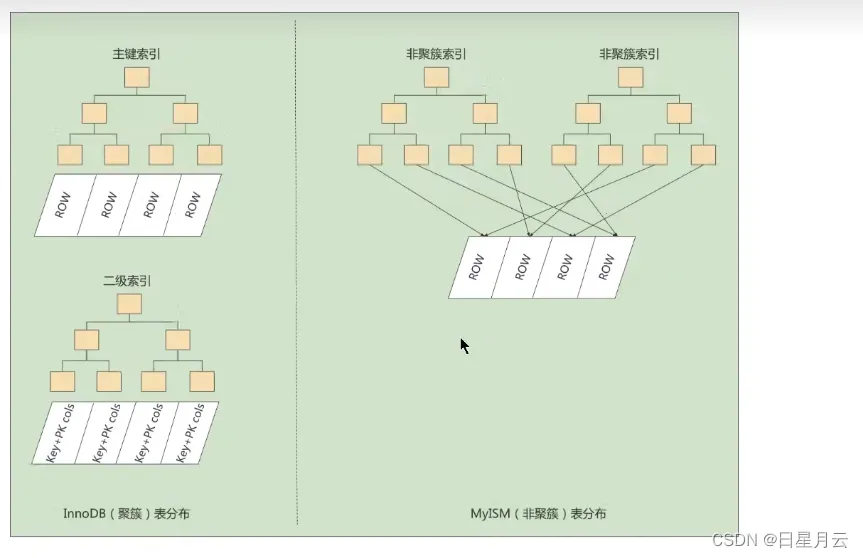 MyISAM的索引方式都是“非聚簇”的,与InnoDB包含1个聚簇索引是不同的。小结两种引擎中索引的区别: