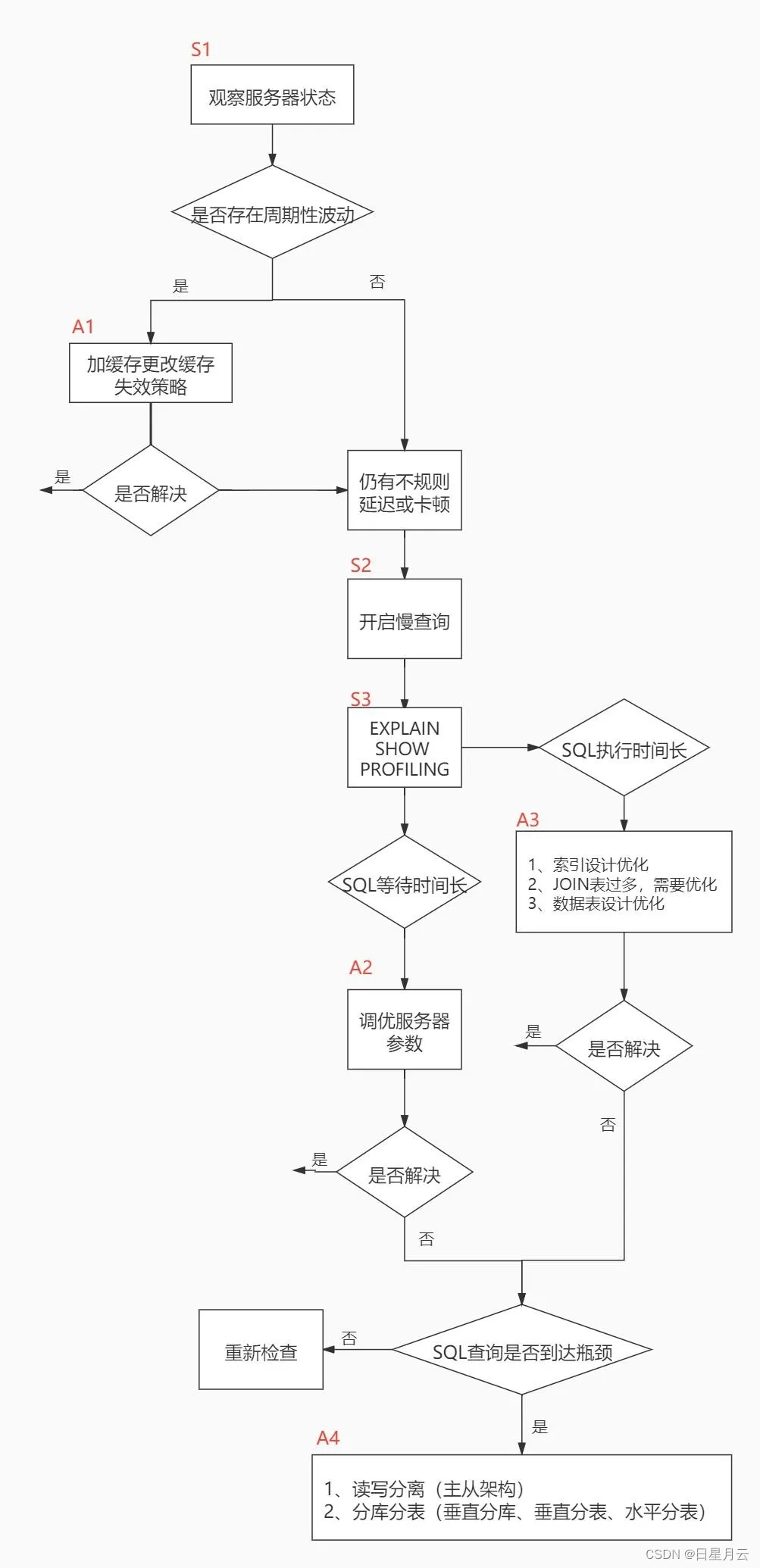 如果A2和A3都不能解决问题,需要考虑数据库自身的SQL查询性能是否已经达到了瓶颈,如果确认没有达到性能瓶颈,就需要重新检查,重复以上的步骤。如果已经达到了性能瓶颈,进入A4阶段,需要考虑增加服务器,采用读写分离的架构,或者考虑对数据库进行分库分表,比如垂直分库、垂直分表和水平分表等。