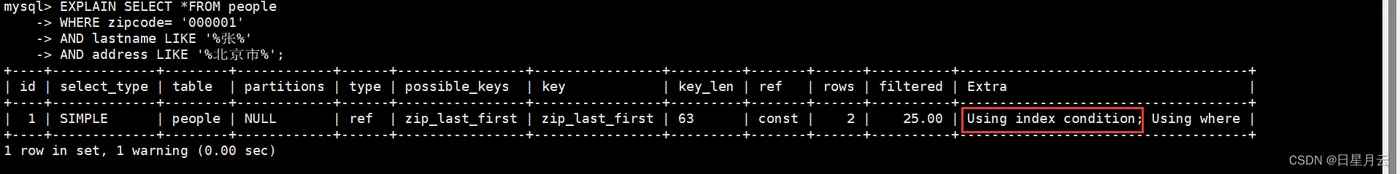 SELECT * FROM people WHERE zipcode= '008881' AND lastname LIKE '%张%' AND address LIKE '%北京市%'; #Using index condition; Using where