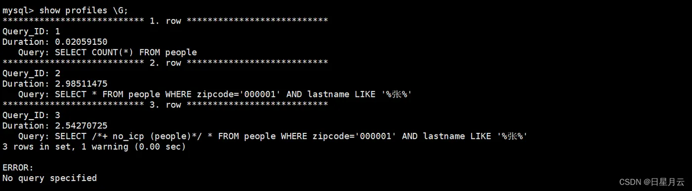 SELECT /*+ no_icp (people)*/ * FROM people WHERE zipcode='000001' AND lastname LIKE '%张%';