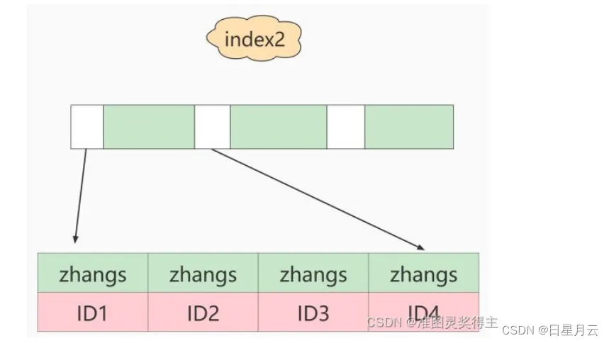 1.从index2索引树找到满足索引值是’zhangs’的记录,找到的第一个是ID1;