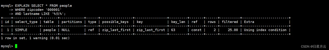 EXPLAIN SELECT * FROM people WHERE zipcode= '000001' AND lastname LIKE '%张%'; #Using index condition