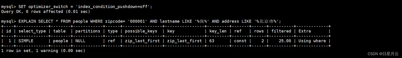 SET optimizer_switch = 'index_condition_pushdown=off'; #Using where EXPLAIN SELECT * FROM people WHERE zipcode= '000001' AND lastname LIKE '%张%' AND address LIKE '%北京市%'; SET optimizer_switch = 'index_condition_pushdown=on' ; #Using index condition; Using where