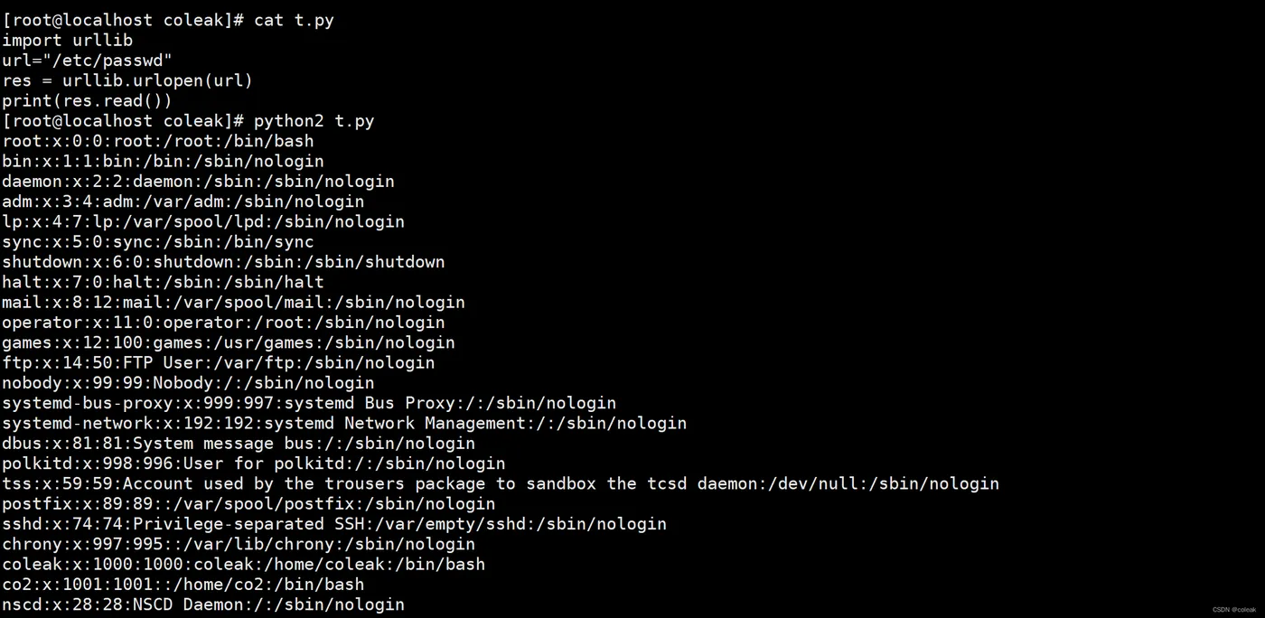 1. import urllib 2. url="/etc/passwd" 3. res = urllib.urlopen(url) 4. print(res.read())