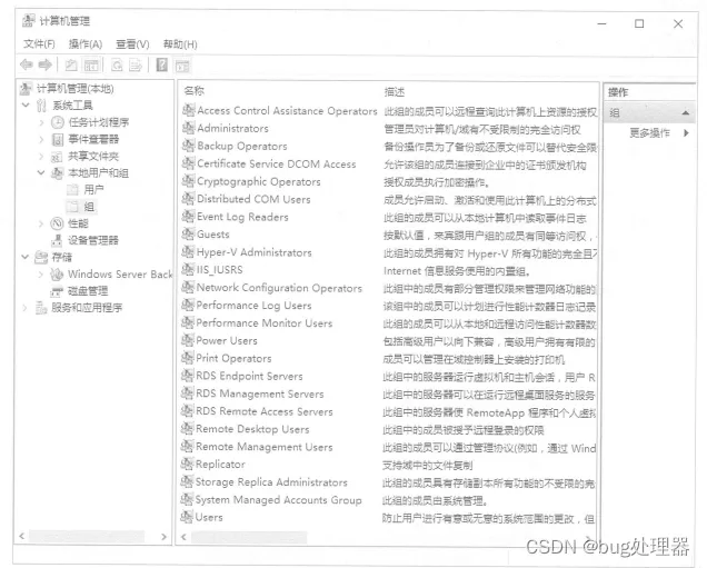 在Windows Server2016中,组的管理操作也可以在“计算机管理”窗口中进行,如图所示,打开“计算机管理”窗口,在左侧的控制台树中依次展开“系统工具”→“本地用户和组”→“组”,即可查看并管理本地组。组的管理操作同样需要以管理员用户身份进行。