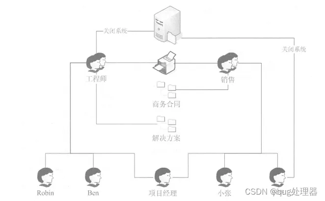 门设置。如图所示,要使用户robin、Ben和项目经理可以使用打印机、关闭服务器和访问“解决方案”文件,不需要为他们每个人设置这些权限,只需为“工程师”组设置这些权限即可。