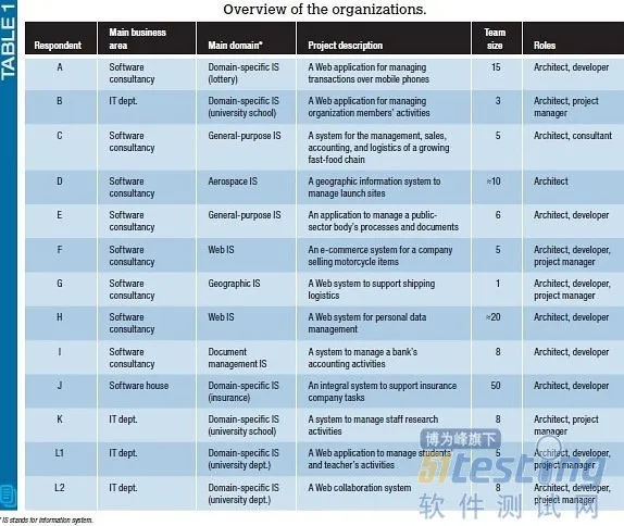 尽管所有访谈对象都在各自项目中履行架构师职责,但他们的所在机构并没有专门设置软件架构师职位。相反,机构是根据技术知识或经验来为各个项目选择架构师的。除去一个例外,其他所有访谈对象都同时还兼任其他角色(如项目经理、顾问或开发者)。