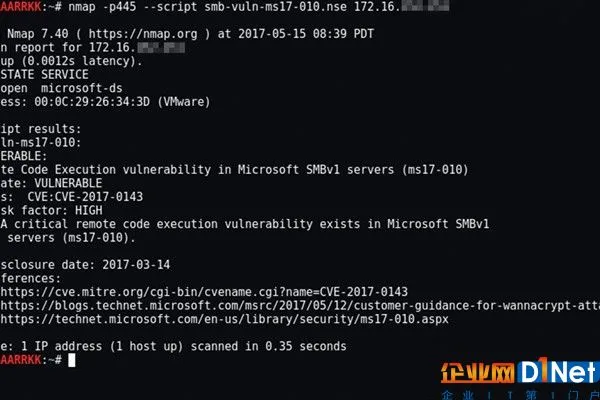 不过有技术人员利用Nmap网络扫描的探测工具制作了一种探测脚本script :smb-vuln-ms17-010.nse(查看这里),大约10秒钟时间便可以检测大约200台电脑。