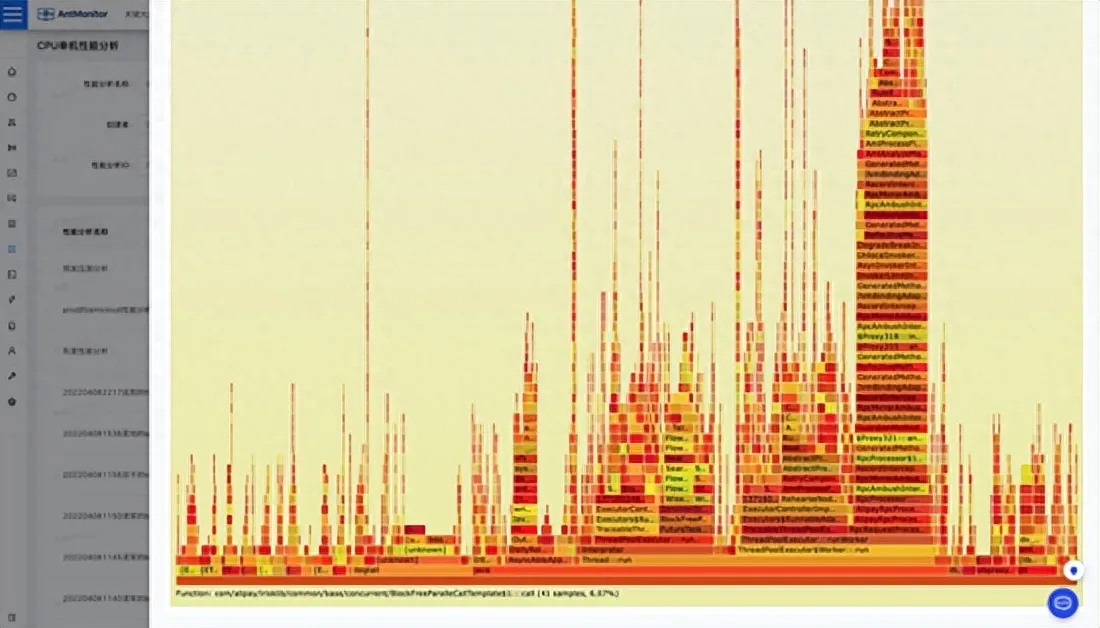 蚂蚁的一线研发运维,可以在平台上直接或间接(通过告警自动触发)做CPU的细粒度分析。基本上,用户可以从宏观的指标到精确的代码行,都能得到定量分析。图示为on cpu的火焰图分析。