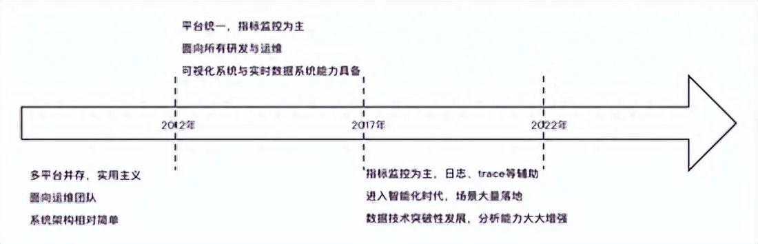 早在2011年前,监控平台就已经完成初代建设,在2012到2017年这五年间,蚂蚁监控技术团队抽象出了业务视角监控牵引的模式,大大提升了核心业务的故障发现能力,同期研发了可视化引擎与易用的配置系统。为了支撑双11等大规模海量计算场景,在底层数据技术上做到了实时稳定的大规模日志和指标处理能力。随着这些能力的完成,可观测平台的产品也逐渐成熟。