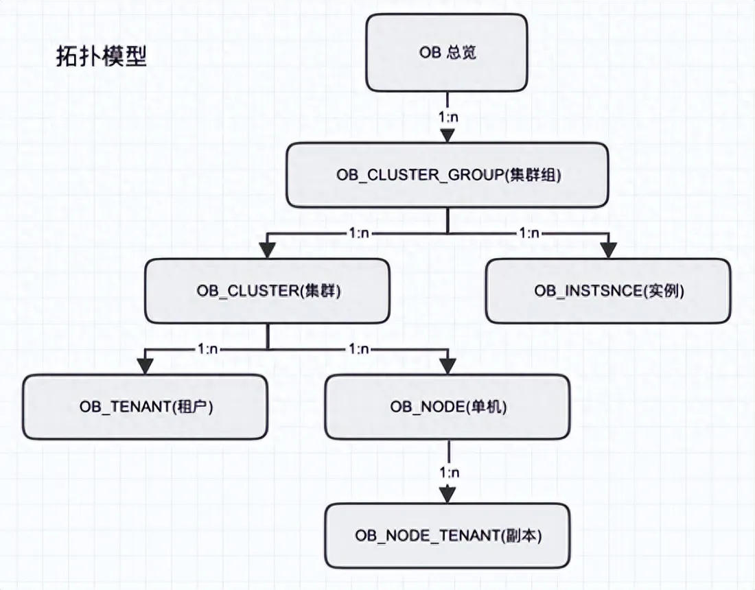第二是实体化 。平台有能力让了解每一个组件结构模型的人,为每一个实体建立所需要的实体采集模板、展现模版和告警模版。下图以内部的分布式数据库 oceanbase 举例,通过定义不同的实体模型就可以很清晰的了解它的拓扑模型(如下图),然后根据用户的需要对不同的实体采集指标数据,并汇聚成不同维度的数据源,然后根据数据源定义不同的展现模版。