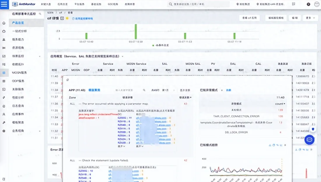 下图上,我们可以看到底层的表格上均是关于错误量级的指标监控,同时点开也能看到错误的具体日志详情,这里对日志做了大量的模式归类、运维维度的聚合。这极大提升了业务排障的效率。