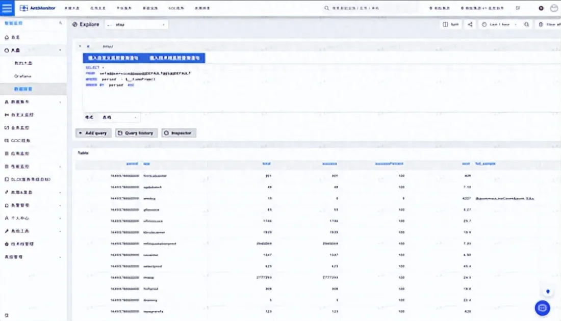 数据分析视角中,最直观的其实就是 查询语言 。可观测平台内部,对所有的结构化数据分成了两大类表: 时序表和维度表 。针对时序表,蚂蚁监控技术团队兼容了业界在指标监控领域比较流行的promQL,用户可以直接提交进行查询。对于需要更丰富表达能力的分析诉求,平台上针对维度表和时序表都可以执行SQL查询,包括复杂的互相join操作等均支持。